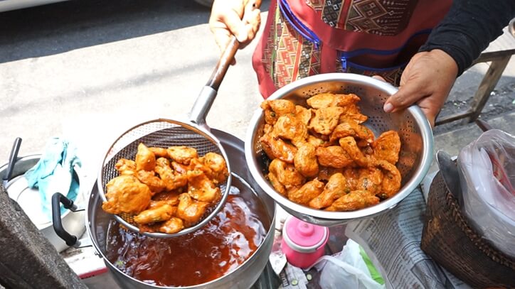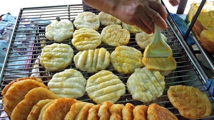 Khao jee – Common Isan snack of grilled day old sticky rice, basted in an egg batter and then deep fried. Rating: Great little sweet snack with crispy outside and soft inside.