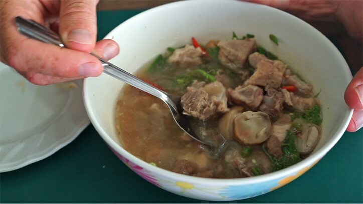 Tom saeb graduk moo – A common Isan soup made with pork bones. Rating: As you see from the video, the spice smacks you right in the face but then magically dissipates for a softer vinegar flavor. Rollercoaster of emotions.
